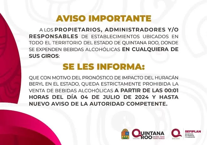MmChetumal.- Debido a la contingencia hidrometeorológica generada por el paso del huracán “Beryl” en el estado y con la finalidad de salvaguardar el orden y como parte de las acciones de prevención hacia la población, la gobernadora Mara Lezama Espinosa a través de la Secretaría de Finanzas y Planeación (SEFIPLAN), ha dispuesto la prohibición de la venta de bebidas alcohólicas en todo el estado a partir de las 00:01 horas del día jueves 04 de julio de 2024 y hasta que la autoridad pertinente así lo determine.