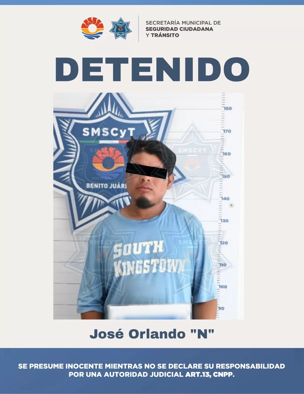 Cancún, 31 de mayo (InZoom.Mx).- Agentes de la Secretaría Municipal de Seguridad Ciudadana y Tránsito de Benito Juárez detuvieron al tabasqueño José Orlando “N”, de 25 años de edad, por presunta desobediencia y resistencia de particulares.