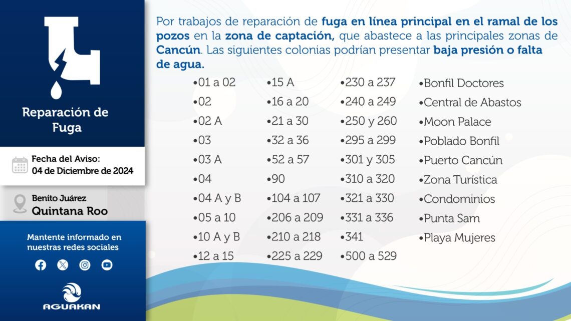 CANCÚN, 4 de diciembre.– Durante la tarde de este miércoles 4 de diciembre, se registró una importante fuga en la línea principal de agua potable del ramal de pozos en la zona de captación que abastece a las principales áreas de Cancún.