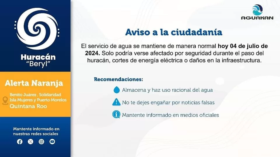 CANCÚN, 4 de julio.— Aguakan confirmó que a pesar de la amenaza que representa el huracán “Beryl”, el servicio de agua potable se sigue prestando con normalidad en toda la región.
