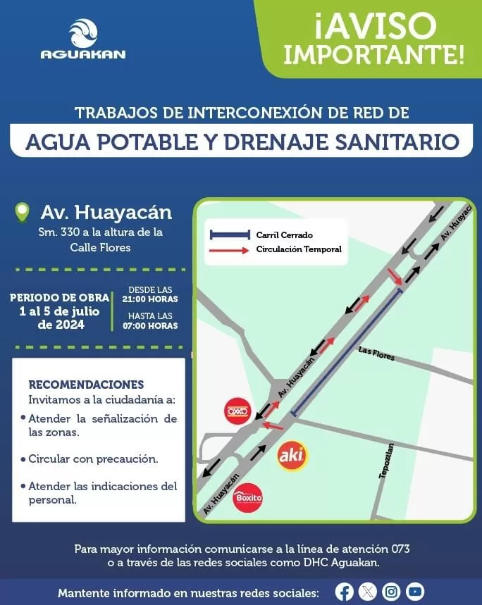 CANCÚN, 1 de julio.— Como parte de su compromiso de mantener informada a la comunidad y ofrecer un servicio de calidad, Aguakan anuncia la realización de trabajos de interconexión para la instalación de la red de agua potable y drenaje sanitario en la Av. Huayacán de Cancún.