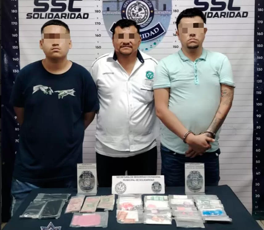 Playa del Carmen, 26 de julio (Infoqroo).- Como resultado de una acción operativa de respuesta inmediata, la Policía Municipal de Solidaridad aseguró a tres personas y más de 60 posibles dosis de narcóticos en la colonia Misión del Carmen.