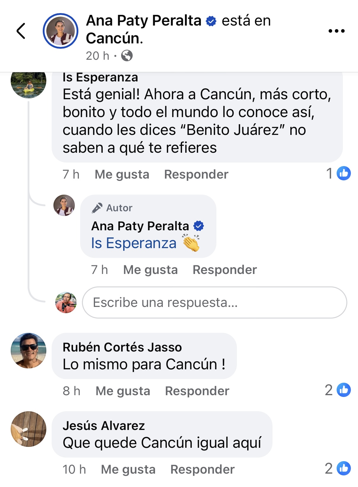 Otros internautas, como Jexus M Gimenex, Jesús Álvarez e Is Esperanza, coincidieron en que sería positivo eliminar el nombre de Benito Juárez para dar identidad oficial a Cancún, dado que muchas personas desconocen que el municipio lleva ese nombre.