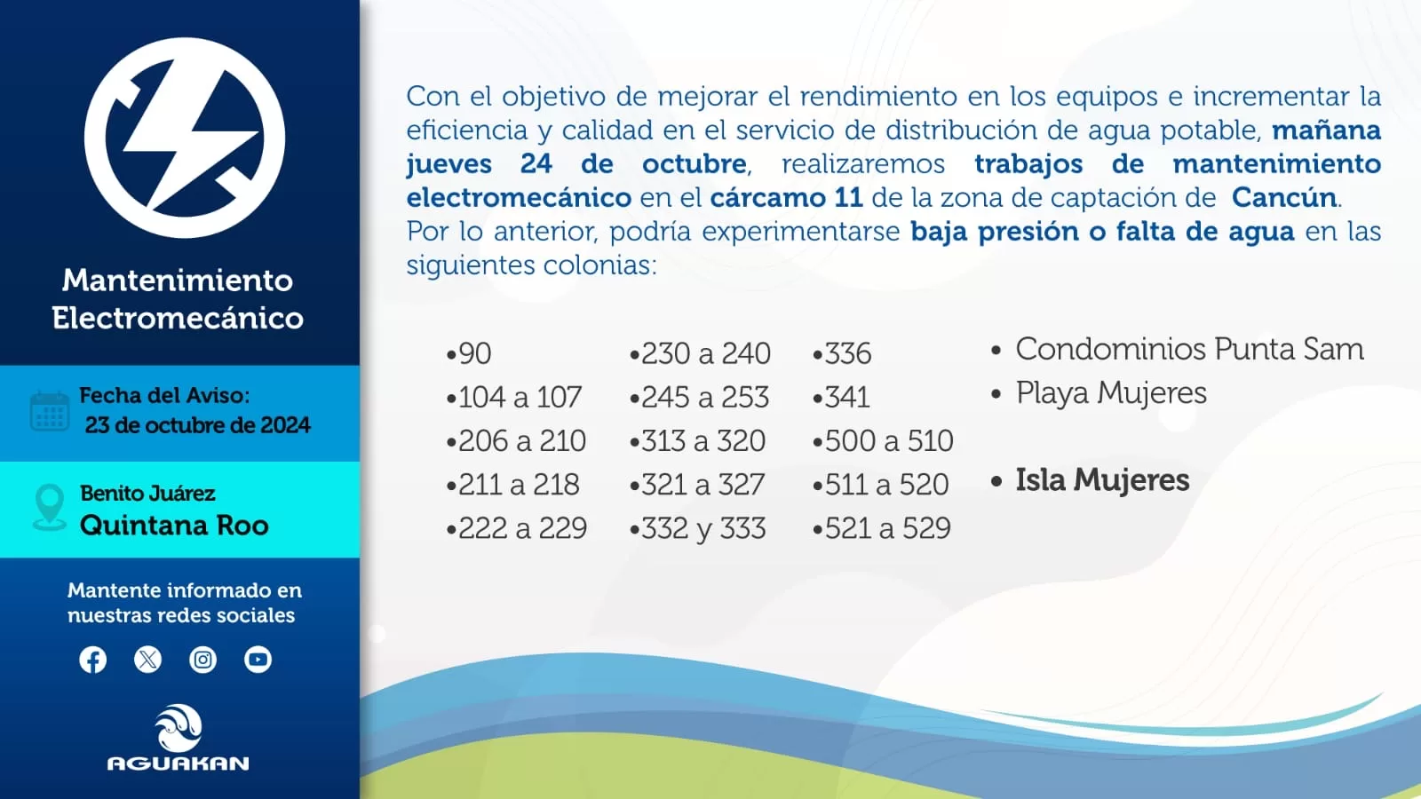Debido a estas labores, durante ese periodo o en las horas siguientes, podría presentarse baja presión o falta de agua en las supermanzanas 90, 104 a 107, 206 a 218, 222 a 240, 245 a 250, 253, 313 a 327, 332, 333, 336, 341, 500 a 529, así como en Playa Mujeres, Condominios Punta Sam e Isla Mujeres.