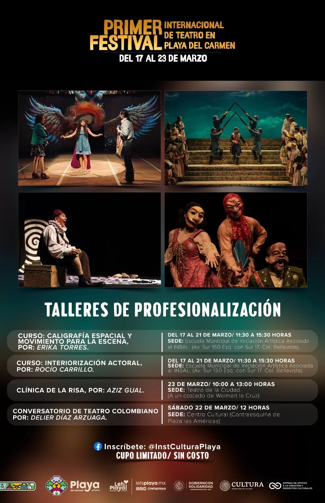 Playa del Carmen, Quintana Roo, 18 de febrero de 2025.- El Primer Festival Internacional de Teatro de Playa del Carmen incluirá cursos y talleres impartidos por profesores del Sistema Nacional de Creadores y que estarán dirigidos a directores teatrales, coreógrafos, actores, actrices, bailarines, mimos y clows.
