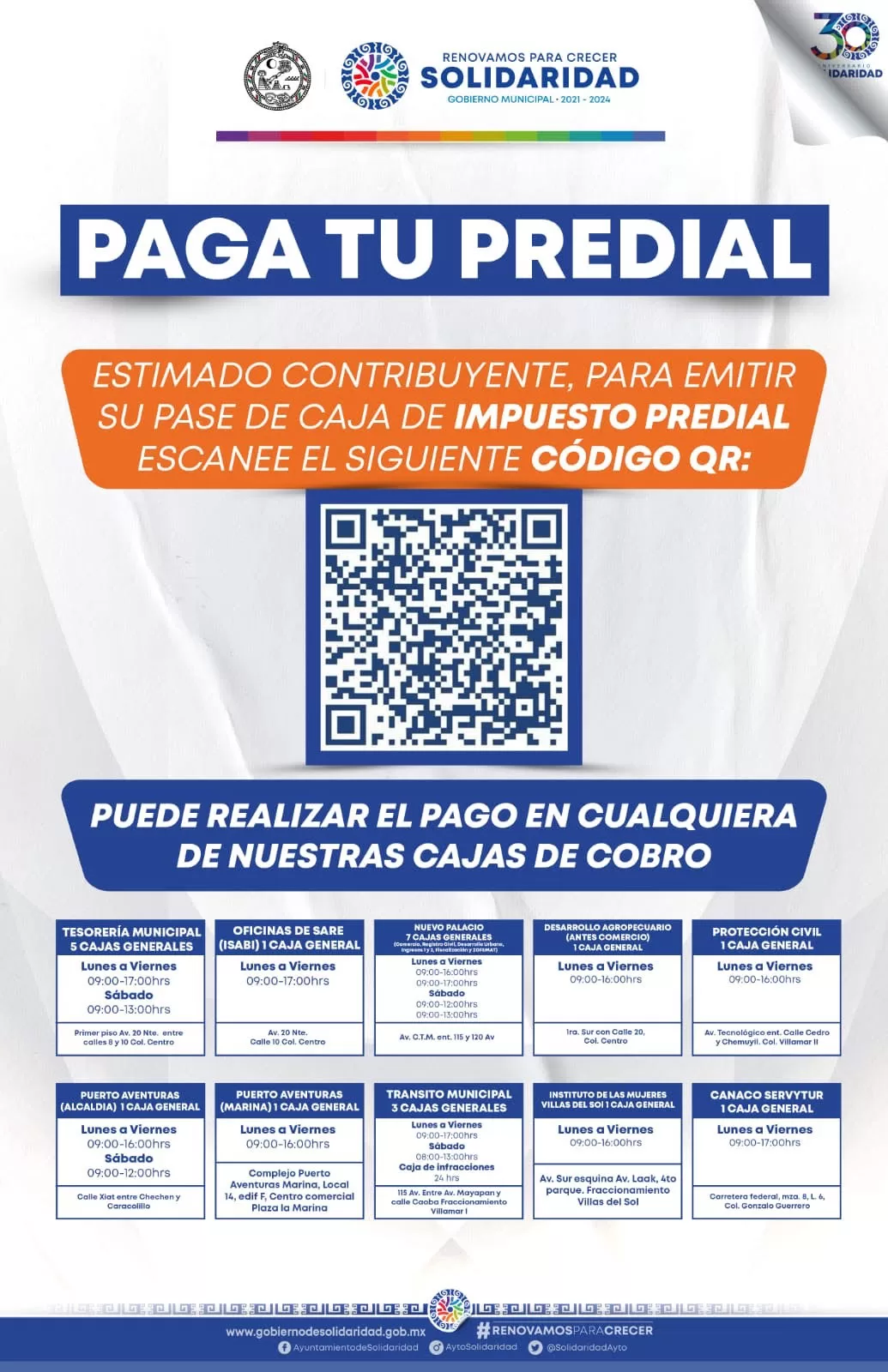 Cabe recordar, que el contribuyente puede acudir de lunes a viernes a cualquiera de las cajas de cobro autorizadas por la Tesorería Municipal, ubicadas en: Palacio del centro, Palacio nuevo,  Protección Civil, Canaco, Tránsito municipal, Instituto de las Mujeres, Oficina del SARE, Desarrollo Agropecuario, Alcaldía de Puerto Aventuras y Puerto Aventuras Marina.