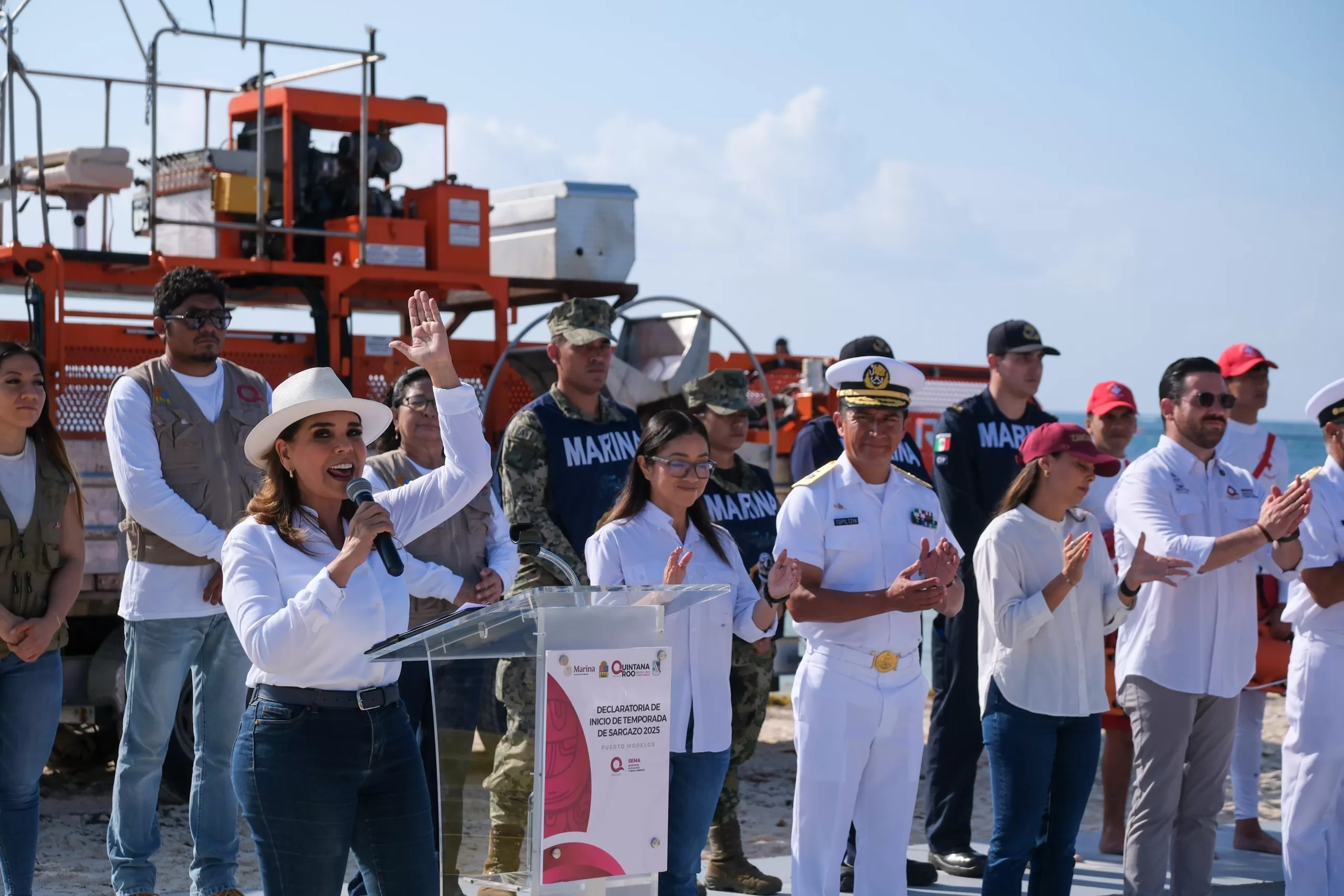Puerto Morelos. – Rodeada del personal, miembros de la sociedad civil, presidentas municipales, con el respaldo indiscutible de la Secretaría de Marina, la gobernadora Mara Lezama Espinosa declaró el inicio oficial de la temporada de sargazo 2025, que contempla una estrategia a gran escala para su monitoreo, contención, recolección y disposición final, con el resultado de mantener limpias las playas el mayor tiempo posible.