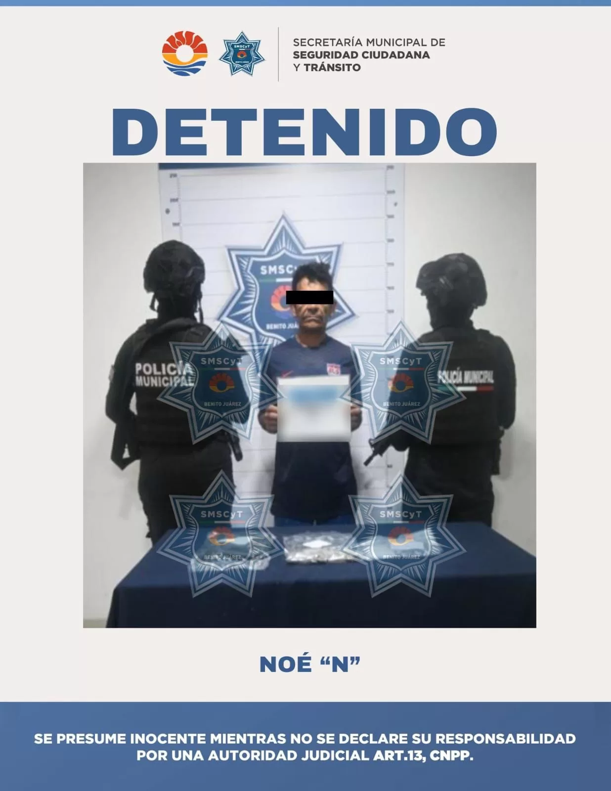Cancún, 14 de agosto (InZoom.Mx).— Un hombre de 52 años, identificado como Noé “N” y originario de Veracruz, fue detenido por elementos de la Secretaría Municipal de Seguridad Ciudadana y Tránsito (SMSCyT) de Benito Juárez, acusado de delitos contra la salud.
