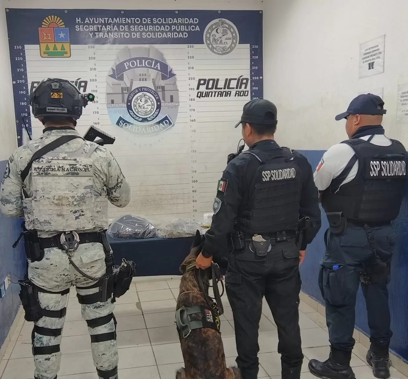 Por otra parte, la Policía Turística, la Unidad Canina y la Guardia Nacional recorrían la Quinta Avenida, cuando un oficial canino realizó un marcaje de alerta a una mochila que se encontraba aparentemente escondida por la avenida Constituyentes, esta contenía 27 envoltorios con lo que parece ser marihuana, 56 con una sustancia similar a la cocaína, 11 con posible metanfetamina, 22 con pastillas, 8 con la droga denominada LSD, así como un envoltorio, 6 sobres y 3 recipientes con una sustancia a determinar.