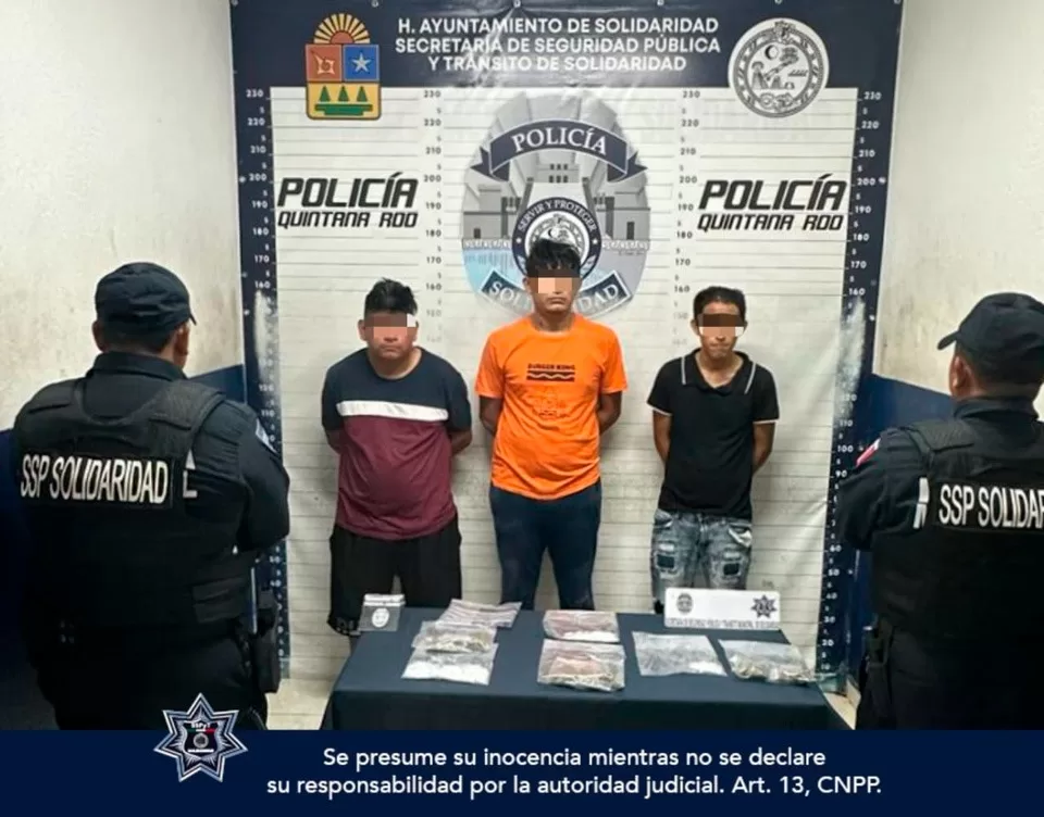 Cuando patrullaban en el fraccionamiento Villas del Sol, los policías aseguraron al campechano Zeus “N”, de 25 años de edad; al chetumaleño Ronal “N”, de 22 años, y al chiapaneco Jesús “N”, de 32 años, con 76 envoltorios con metanfetamina y ocho con marihuana, luego de ser sorprendidos junto a un vehículo tipo Saveiro intercambiándose los narcóticos.