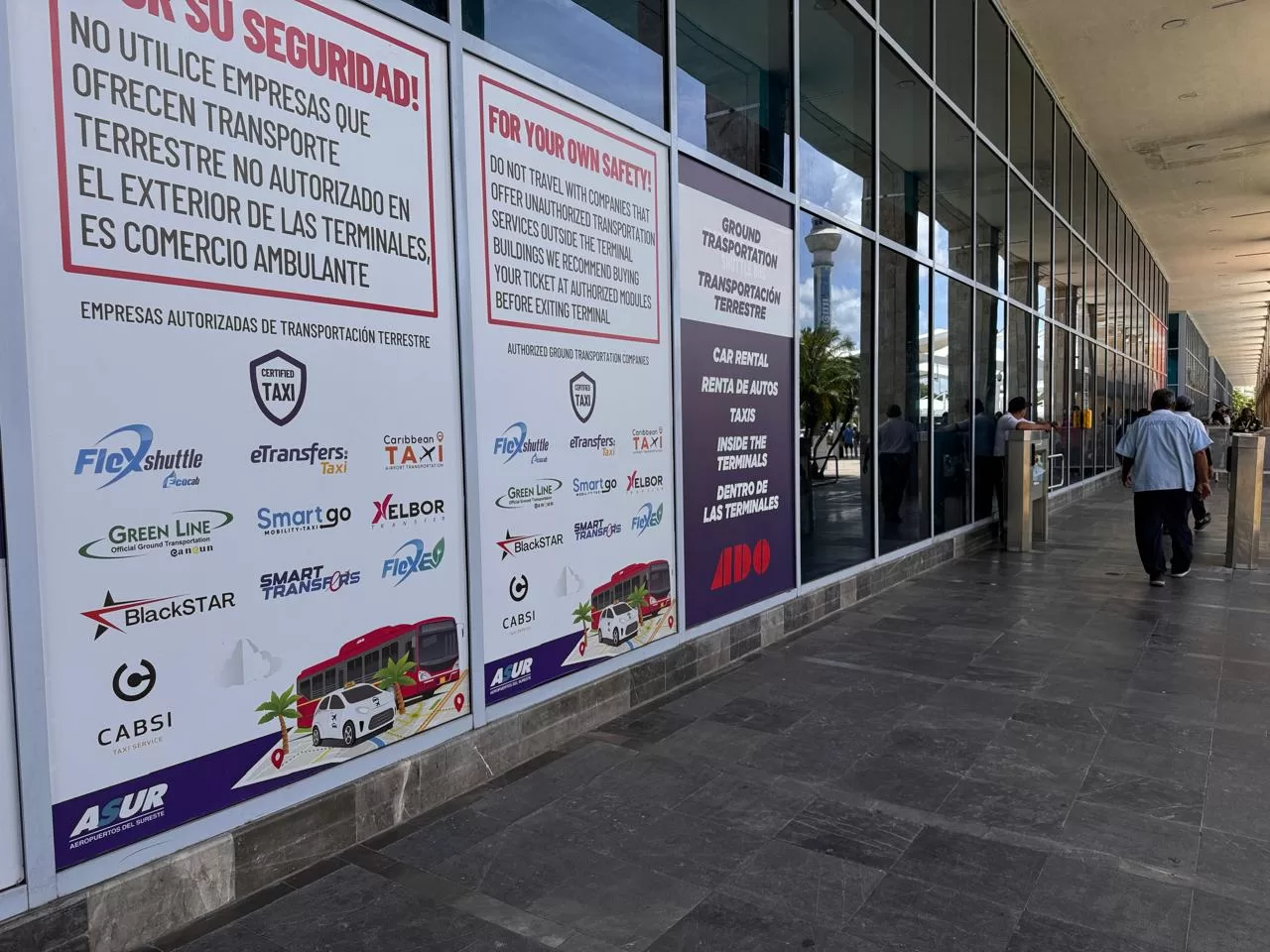 Los letreros, en español e inglés, que son visibles en la terminal 4 donde operan vuelos internacionales, advierten: *“¡POR SU SEGURIDAD! NO UTILICE EMPRESAS QUE OFRECEN TRANSPORTE TERRESTRE NO AUTORIZADO EN EL EXTERIOR DE LAS TERMINALES, ES COMERCIO AMBULANTE”*.