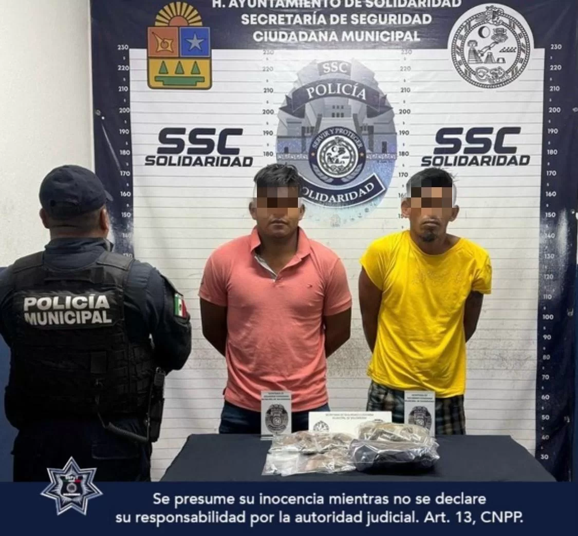 Playa del Carmen, 13 de abril (InZoom.Mx).– Durante un operativo de vigilancia rutinario, elementos de la Secretaría de Seguridad Ciudadana Municipal (SSCM) lograron la detención de dos hombres en posesión de 97 posibles dosis de marihuana en la colonia Luis Donaldo Colosio.