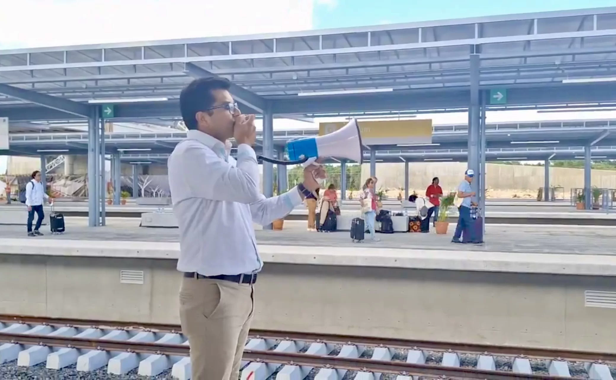 Con megáfono en mano, un empleado de la empresa militar Tren Maya informó a los pasajeros que ingenieros estaban “configurando” el tren en la cochera detrás de la terminal, a espaldas del aeropuerto, atribuyendo la falla a la empresa Alstom, proveedora del equipo rodante.