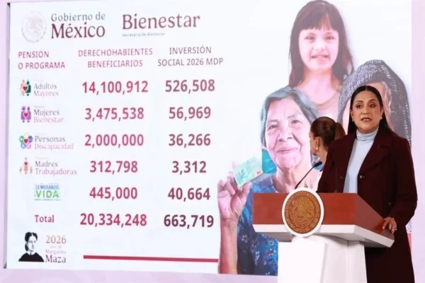 La Secretaria de Bienestar Ariadna Montiel informó que el número de personas que recibirán apoyos monetarios pasarán de 18.5 millones en 2025 a 20.3 millones al cierre de 2026.
