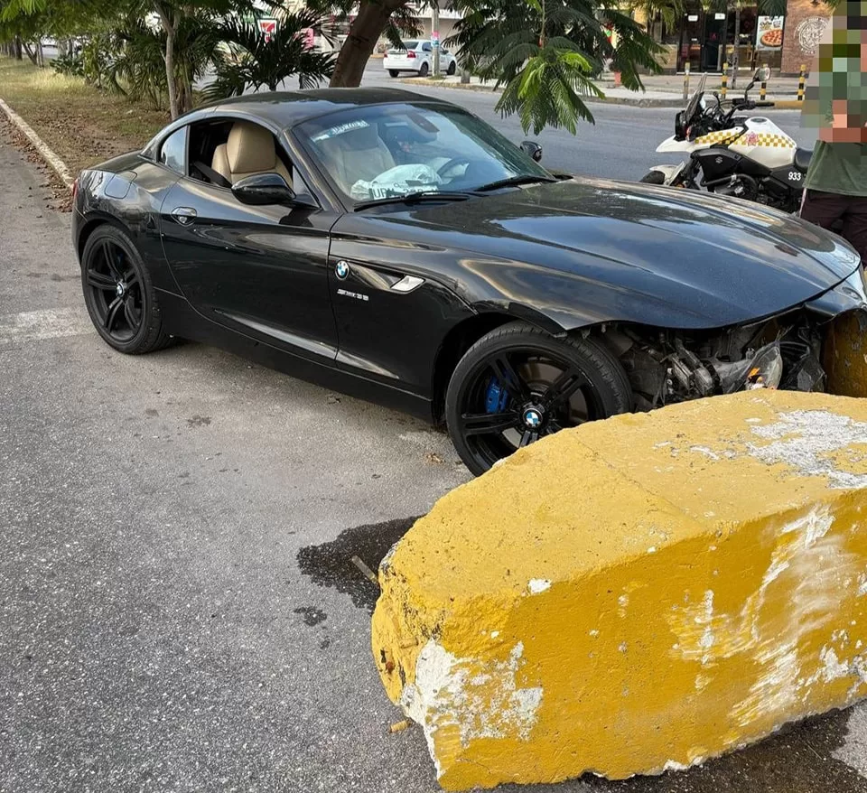 Cancún, 15 de febrero (InZoom.Mx).- Un aparatoso accidente se registró esta mañana en la intersección de las avenidas La Luna con Tecnológico, en la Supermanzana 51, cuando un automóvil BMW Z4 de color negro perdió el control y colisionó contra unos dados de concreto.