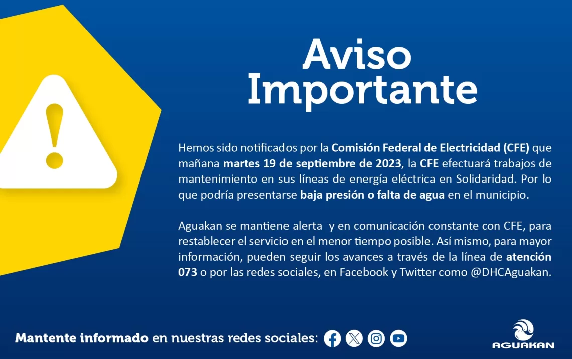 PLAYA DEL CARME , 18 de septiembre.— Con el propósito de optimizar el suministro eléctrico, el martes 19 de septiembre la #CFE llevará a cabo tareas de mantenimiento en el sistema eléctrico en #PlayaDelCarmen, generando una afectación temporal en el servicio de agua potable, con baja presión o falta de agua en todo el municipio. Una vez que la CFE concluya sus labores, se restablecerá el servicio lo más pronto posible. Como medida preventiva, se recomienda almacenar agua desde hoy para reducir las molestias. Para más detalles, consulta el siguiente enlace: https://bit.ly/3reUHn9