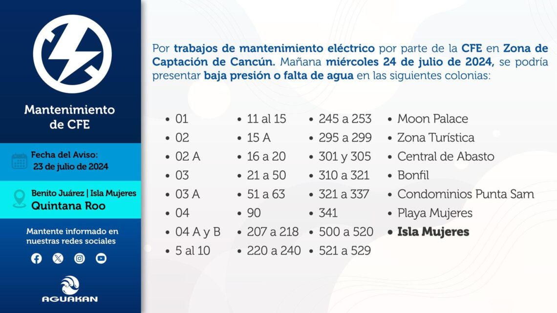 CANCÚN, 23 de Julio.— La Comisión Federal de Electricidad (CFE) notificó a Aguakan sobre la realización de trabajos de mantenimiento en sus redes generales de distribución mañana miércoles 24 de julio.