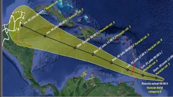 A las 6 am hora de México este domingo 30 de junio, Beryl se encontraba a 675 km al este-sureste de Barbados y a 3,700 km al este-sureste de Cancún, Q. Roo.