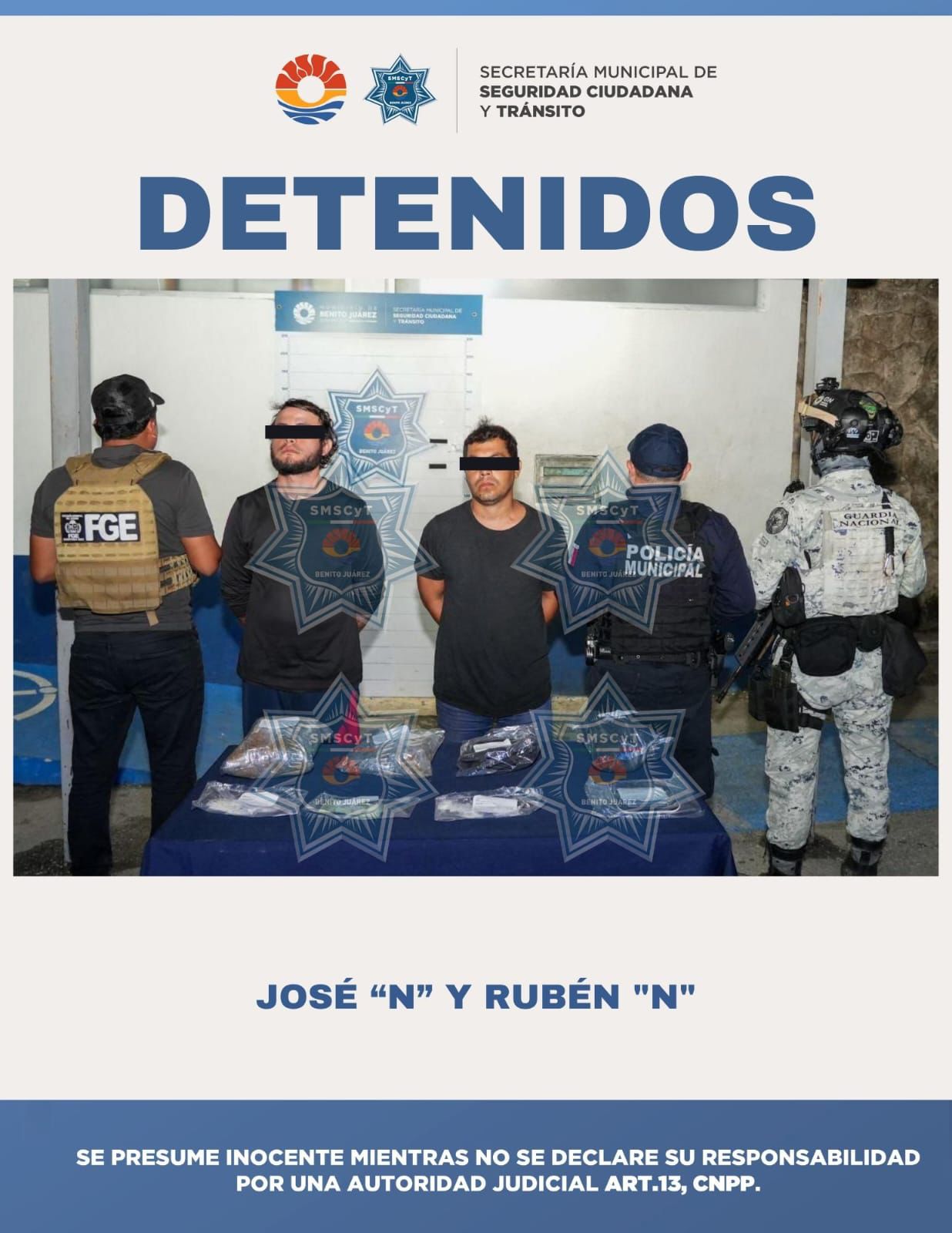 Durante las acciones del operativo “Blindaje Cancún”, agentes de la Secretaría Municipal de Seguridad Ciudadana y Tránsito detectaron a dos hombres que manipulaban bolsas de plástico transparente con presuntos estupefacientes. Al percatarse de la presencia policial, ambos intentaron evadirlos, lo que levantó sospechas.