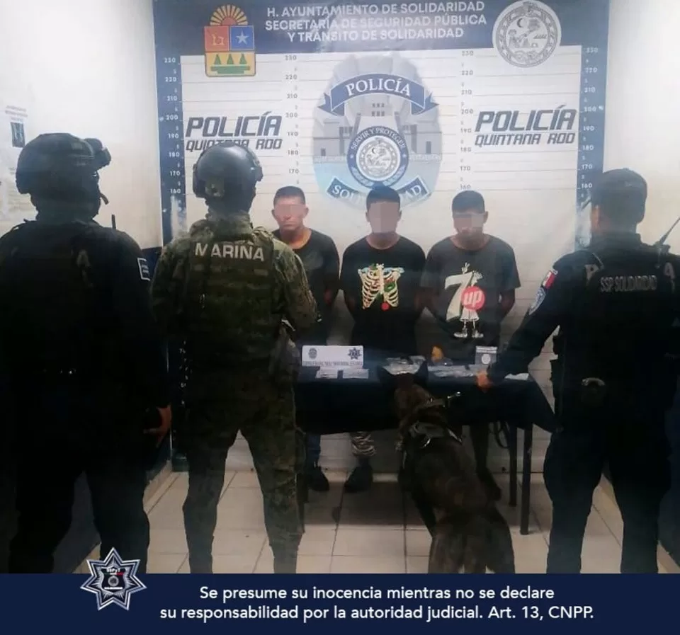 En la colonia In House, elementos de la Policía Preventiva y Unidad Canina, detuvieron a Rafael “N”, de 24 años de edad; Edward “N”, de 16 años, originarios de Tabasco, y Cristian “N”, de 21 años, procedente de Chiapas, que tenían en posesión 12 envoltorios con marihuana, cinco con cocaína, 17 con piedra y tres con cristal.