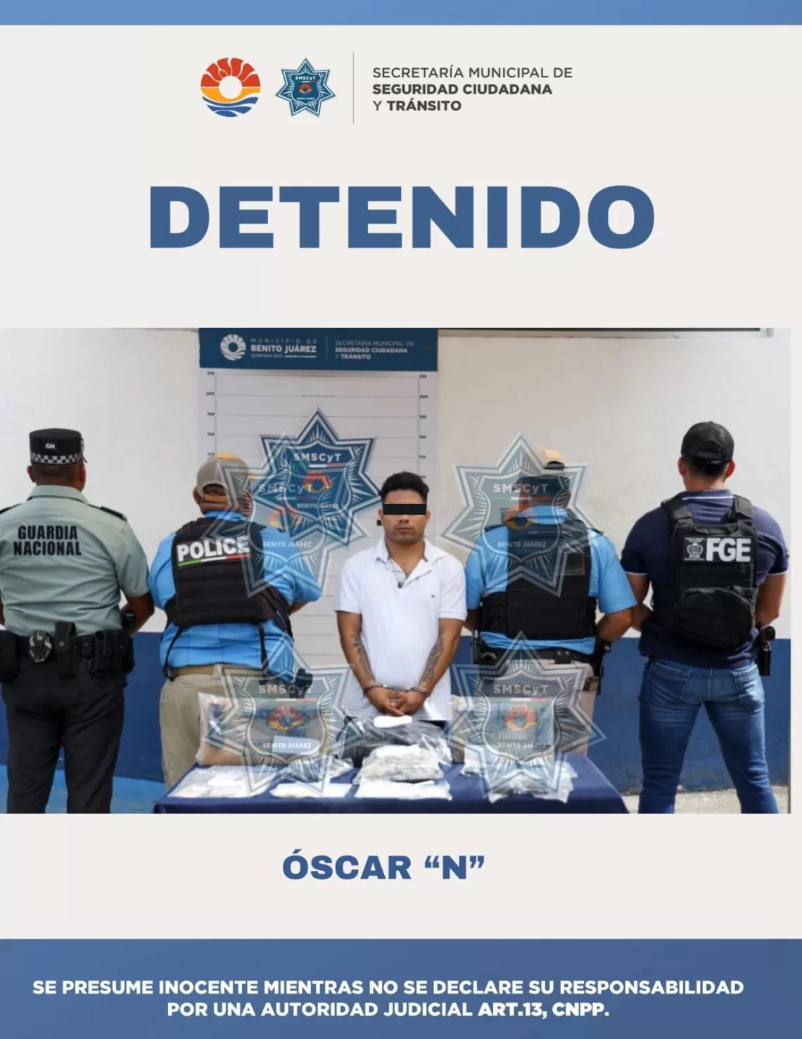 Cancún, 19 de septiembre (InZoom.Mx).- En una acción coordinada entre la Guardia Nacional, la Fiscalía General del Estado (FGE) y la Secretaría Municipal de Seguridad Ciudadana y Tránsito de Benito Juárez, fue detenido un hombre por su presunta participación en delitos contra la salud, en la modalidad de narcomenudeo, así como por portación de arma de fuego.