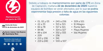 CANCUN Afectación en el servicio de agua potable en Cancún e Isla Mujeres por trabajos de la CFE 21 diciembre, 2025