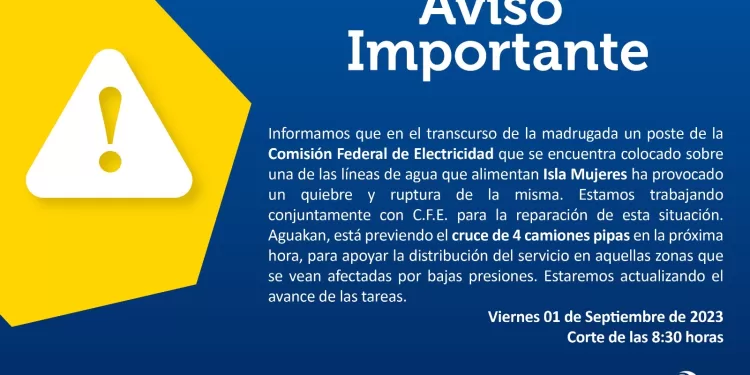 ISLA MUJERES Atiende Aguakan rotura de tubería en Isla Mujeres ocasionada por poste de la CFE 1 septiembre, 2023