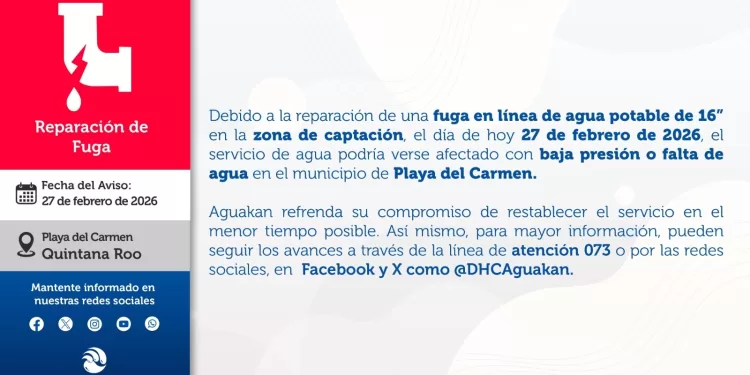 CANCUN Fuga de agua potable en zona de captación podría afectar el servicio en Playa del Carmen 27 febrero, 2026