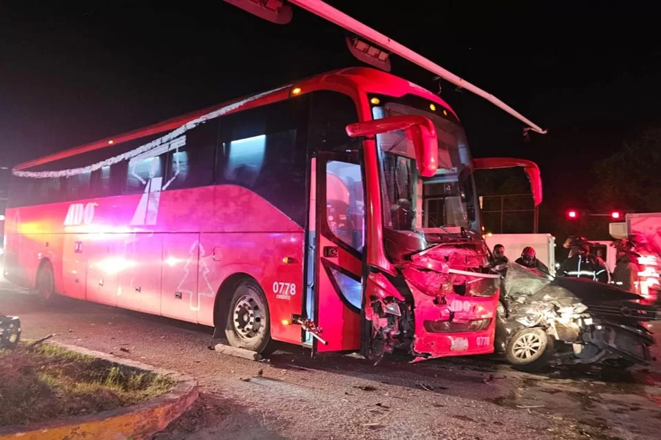 Cancún, 13 de diciembre (InZoom.mx).– Una persona murió y otra resultó lesionada esta mañana, poco después de las 5:30, producto del choque entre un autobús Volvo de la empresa ADO y un Volkswagen Vento de color negro, a bordo del cual viajaban el fallecido y el lesionado.