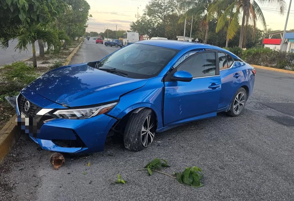 Cancún, 19 de marzo (InZoom.mx).- Un automóvil Nissan Sentra de color azul, cuyo conductor perdió el control de la dirección, se proyectó esta mañana contra una palmera y la base de un poste metálico del camellón central de la avenida Lak’in, sin que se reportaran personas lesionadas.