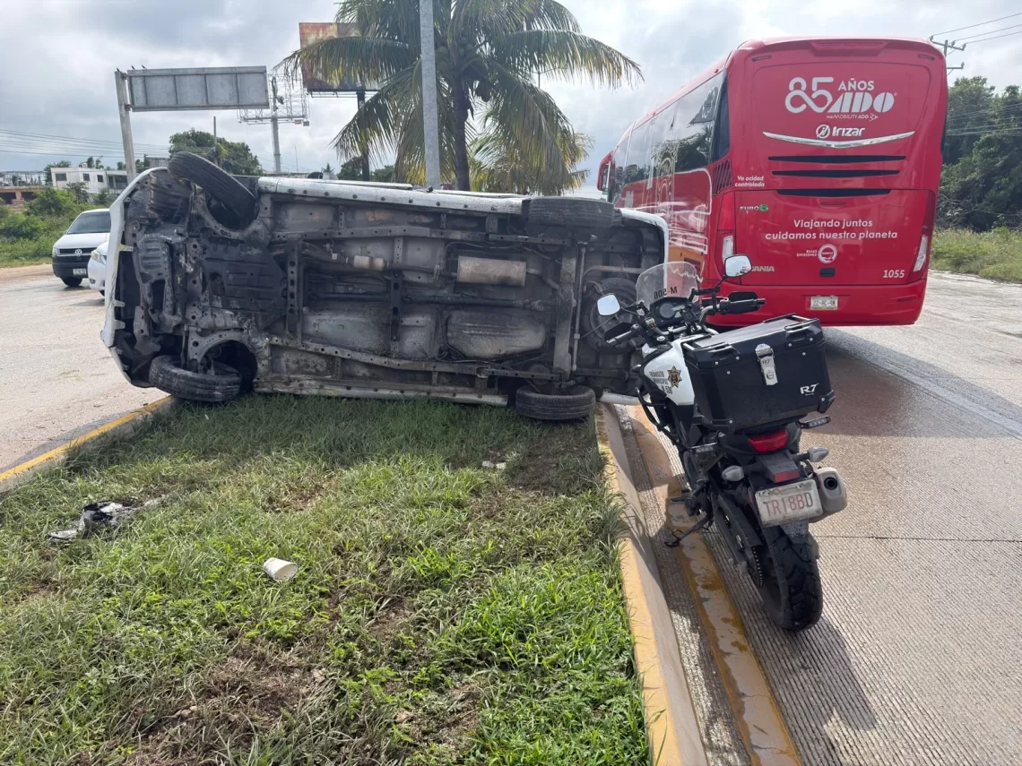 Cancún, 13 de noviembre (InZoom.Mx).- Un Toyota Avanza blanco con verde terminó volcado esta tarde en el bulevar Colosio, a la altura de las bodegas Apq, luego de que el conductor perdiera el control de la unidad mientras circulaba rumbo al Aeropuerto.