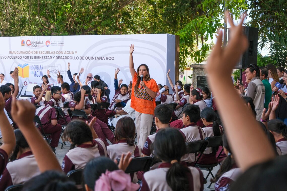 Cancún.- Al inaugurar el proyecto “Escuelas con Agua”, en el marco del Acuerdo Nacional por el Agua que impulsa la Presidenta Claudia Sheinbaum, la gobernadora Mara Lezama Espinosa expresó que no se trata simplemente de un programa, sino de abrir las puertas de un futuro más justo, un acto de amor hacia nuestra niñez.