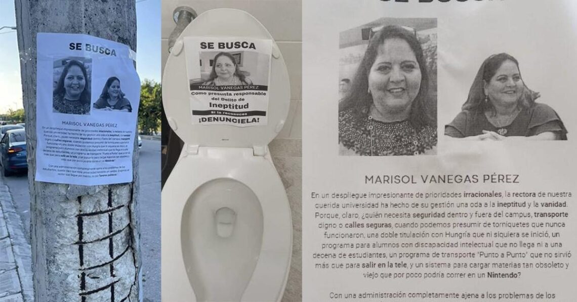 Con carteles pegados en muros, postes del alumbrado público e, incluso, en tapas de los excusados de la institución educativa, los estudiantes aseguraron estar “hartos” del desempeño de su Rectora, quien solo acude a la Unicaribe una o dos veces por semana.