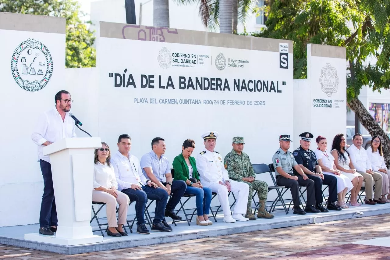 Playa del Carmen, Quintana Roo, 24 de febrero de 2025.- Autoridades de Solidaridad, encabezadas por el oficial mayor Guillermo Andrés Brahms González, conmemoraron esta mañana el Día de la Bandera con el llamado a construir un futuro de paz, desarrollo y justicia para todos.