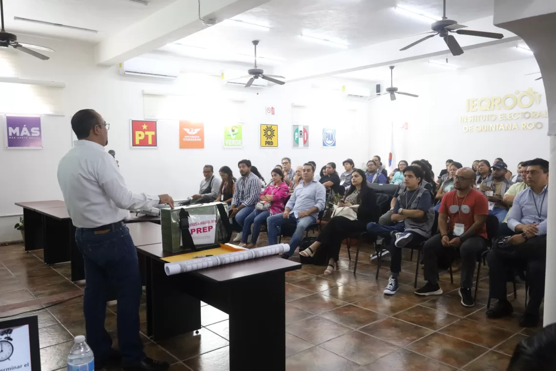 Reunidos en la sala de sesiones del Instituto Electoral de Quintana Roo (IEQROO), en el marco del curso-taller y simulacro respecto a las sesiones de cómputo, dirigido a las consejeras, consejeros, vocalías y supervisoras, supervisores electorales, capacitadoras y capacitadores asistentes electorales, así como, de representantes de los partidos políticos, también estuvieron presentes, la Consejera Presidenta del Instituto, Rubí Pacheco Pérez; las consejeras, Claudia Ávila Graham; Elizabeth Arredondo Gorocica; María Salomé Medina Montaño; Adrián Amilcar Sauri Manzanilla y el expositor Juan César Hernández Cruz.