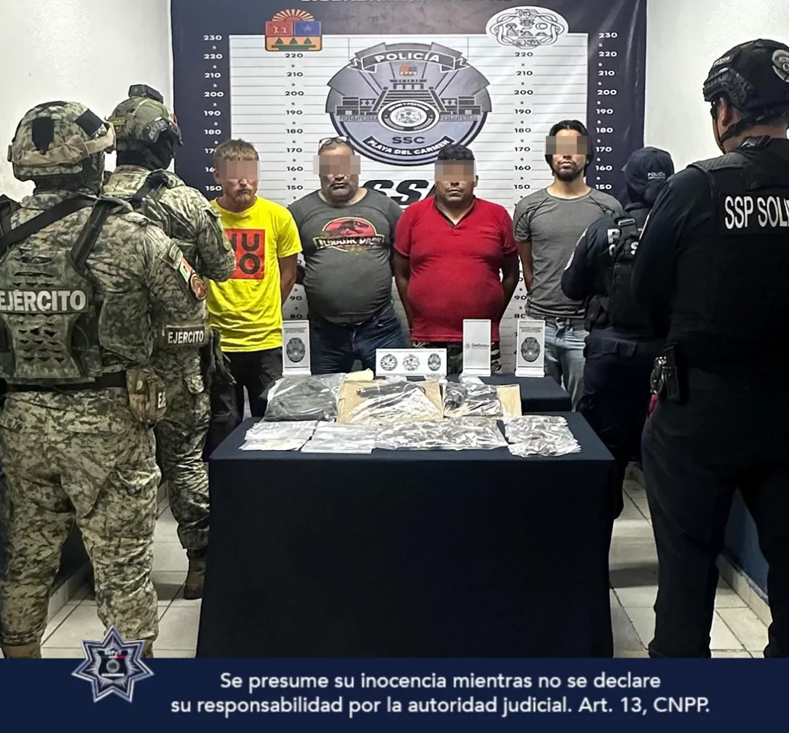 Playa del Carmen, 2 de junio (InZoom.mx).— La Secretaría de Seguridad Ciudadana, en coordinación con autoridades federales y estatales, detuvo en la colonia Ejido a cuatro personas por presuntos delitos contra la salud y violación a la Ley Federal de Armas de Fuego y Explosivos, con dos armas de fuego y diversos envoltorios de posibles narcóticos.