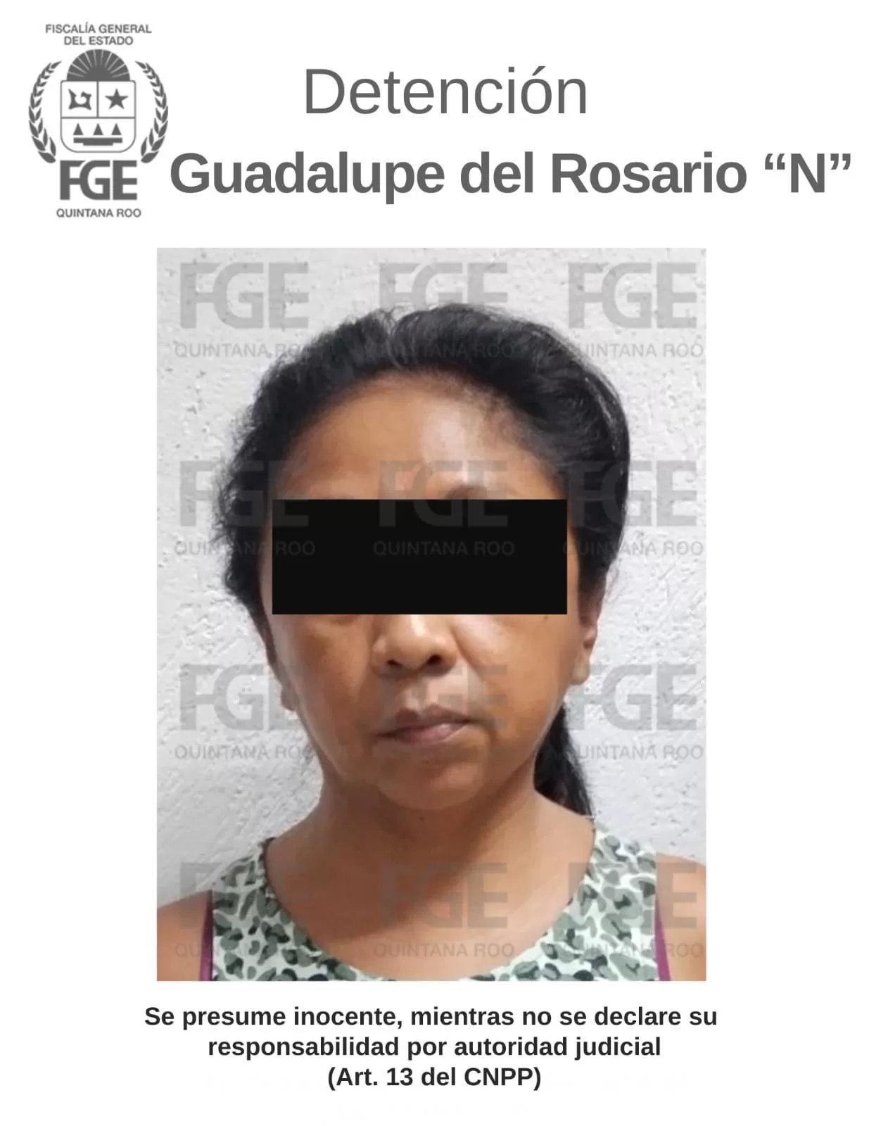 Solidaridad.– La Fiscalía General del Estado informa que cumplimentó orden de aprehensión en contra de una persona del sexo femenino, identificada como Guadalupe del Rosario “N”, por su probable participación en hechos constitutivos de delitos electorales en este municipio, en su modalidad de solicitud de votos con la promesa de recibir dinero en tarjetas electrónicas, en dos parcialidades.