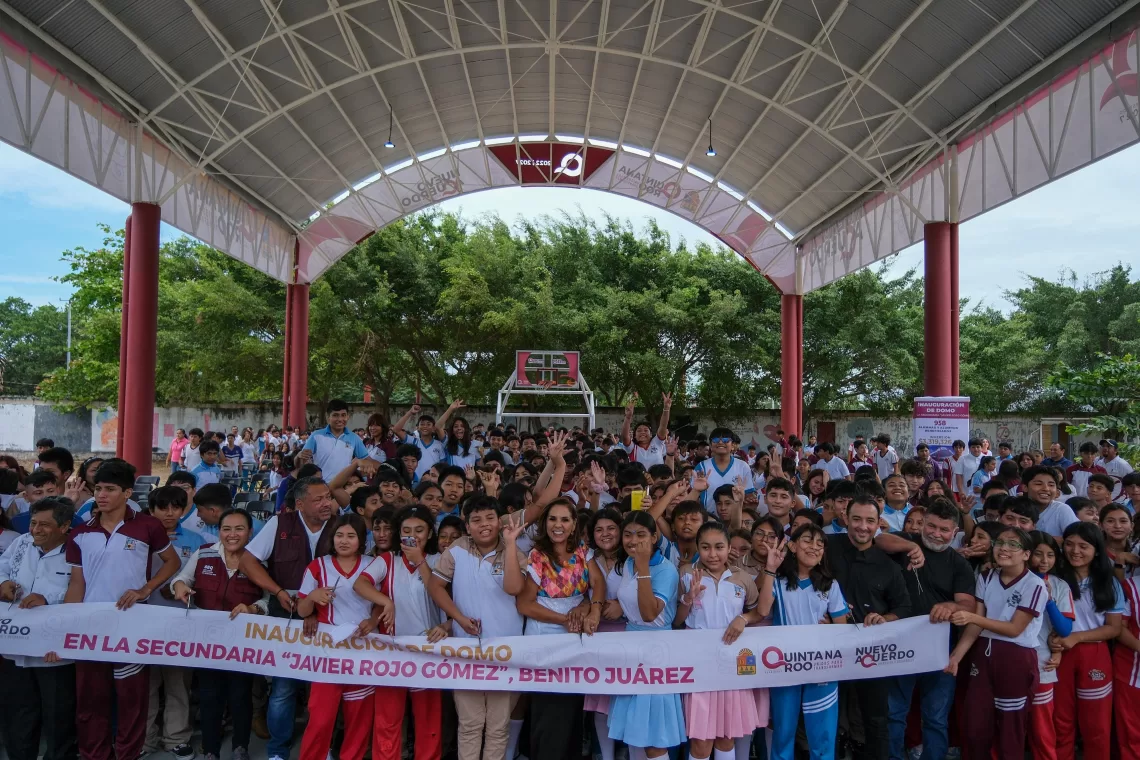 Cancún. – Después de 21 años de espera y en tan solo 4 meses de solicitarlo, las y los alumnos de la escuela secundaria “Javier Rojo Gómez” de Cancún recibieron de la gobernadora Mara Lezama Espinosa su nuevo domo, para tener un espacio que los proteja de las inclemencias del clima.