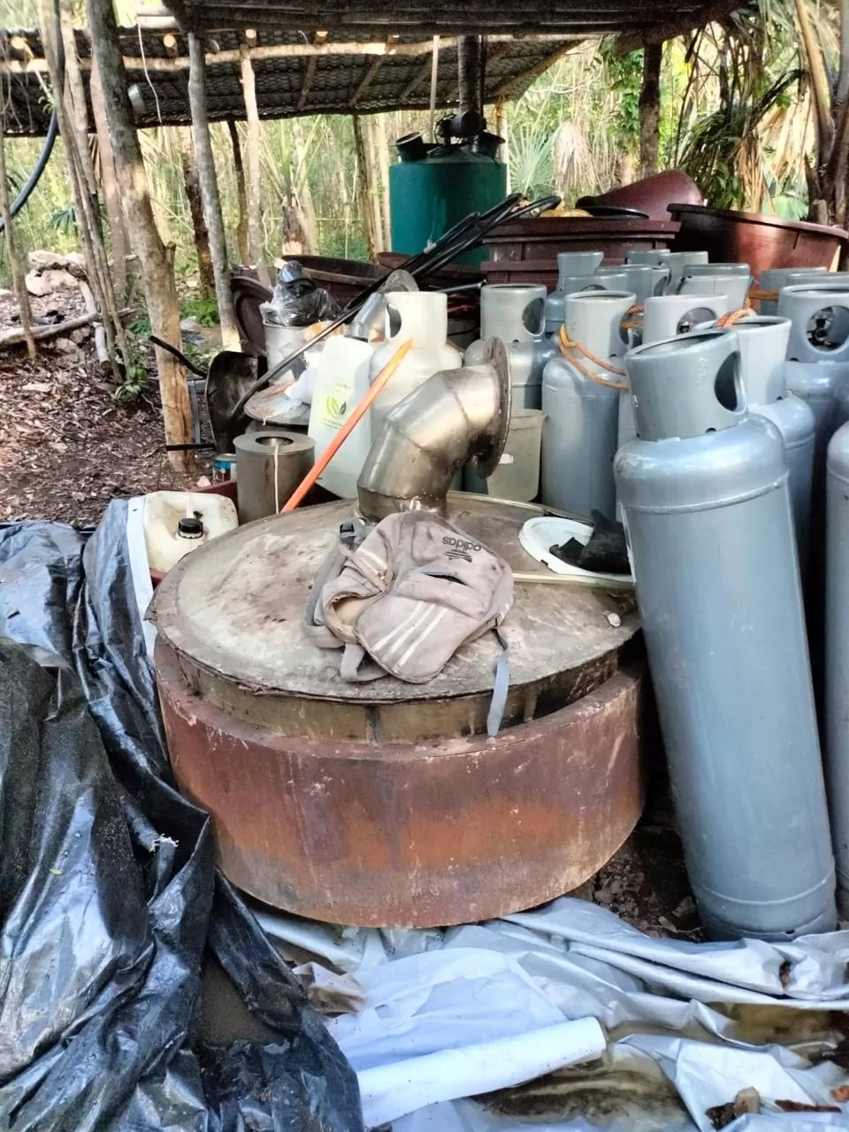 Gracias a trabajos de inteligencia y vigilancia territorial, las unidades lograron ubicar el punto donde operaba el laboratorio, en una zona apartada rodeada por vegetación y cuerpos de agua. En el sitio se encontraron diversos indicios del procesamiento de sustancias ilícitas: bidones con líquidos desconocidos, costales con material cristalino, porta fusiles y pistoleras, casquillos percutidos, tanques de gas, dispositivos de radiocomunicación y bombas de agua conectadas mediante mangueras a lagunas cercanas.
