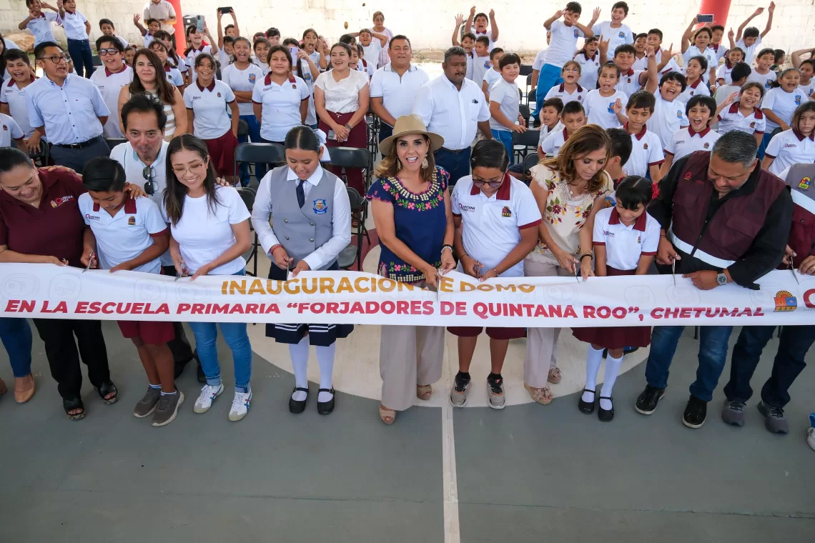 Chetumal.- Con la alegría reflejada en el rostro de 282 niñas y niños reunidos bajo un nuevo y amplio techo, la gobernadora Mara Lezama Espinosa entregó el domo de la escuela primaria “Forjadores de Quintana Roo”, obra que pone fin a casi 40 años de actividades al aire libre sin protección contra sol o lluvia.