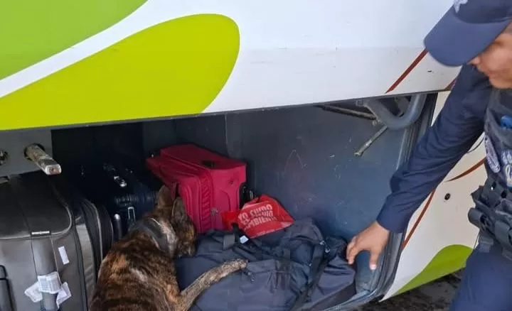 De acuerdo con el reporte oficial, los hechos ocurrieron en el área del maletero de uno de los autobuses, donde el canino comenzó a mostrar cambios de actitud, realizando movimientos repetitivos de cabeza, jalones y ladridos, conductas que indican la percepción de aromas asociados a sustancias ilícitas. El marcaje positivo se realizó sobre una maleta de color negro.
