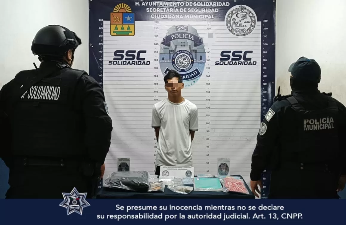 Playa del Carmen, 18 de agosto (Infoqroo).-Durante las acciones de vigilancia y prevención del delito, la Policía Municipal de Solidaridad aseguró a un hombre por posibles delitos contra la salud en la colonia Colosio.
