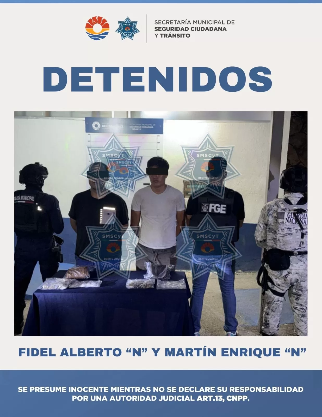 Cancún, 18 de agosto (InZoom.mx).– En una acción coordinada entre la Guardia Nacional, la Fiscalía General del Estado y la Secretaría Municipal de Seguridad Ciudadana y Tránsito (SMSCyT) fueron detenidos dos hombres por su presunta participación en delitos contra la salud, en la modalidad de narcomenudeo.