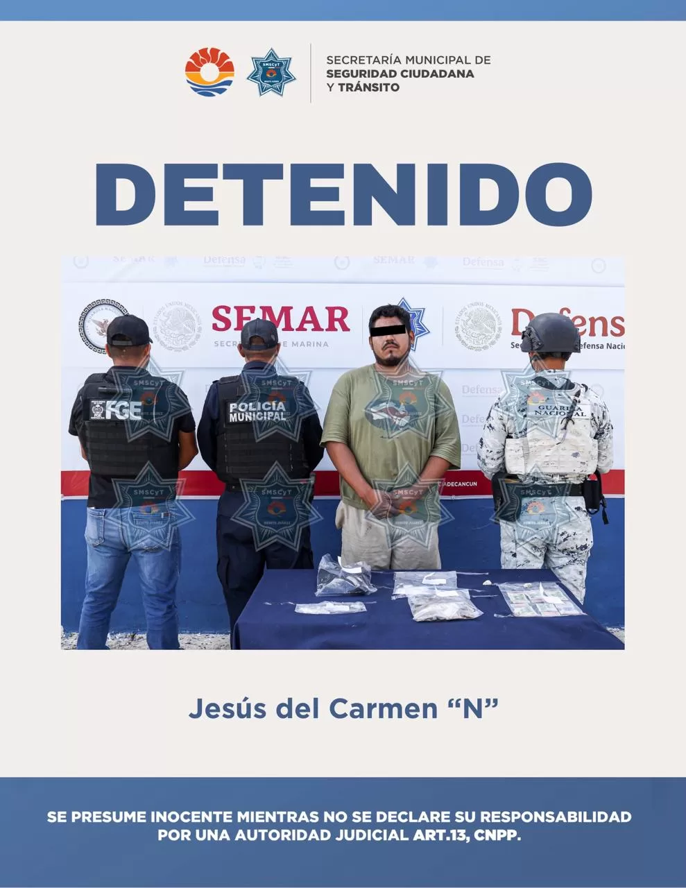 La captura se efectuó durante los recorridos de prevención y vigilancia implementados como parte del operativo Blindaje Cancún. Las autoridades detectaron al sujeto manipulando pequeñas bolsas con aparentes sustancias ilícitas en las inmediaciones de la Supermanzana 59.
