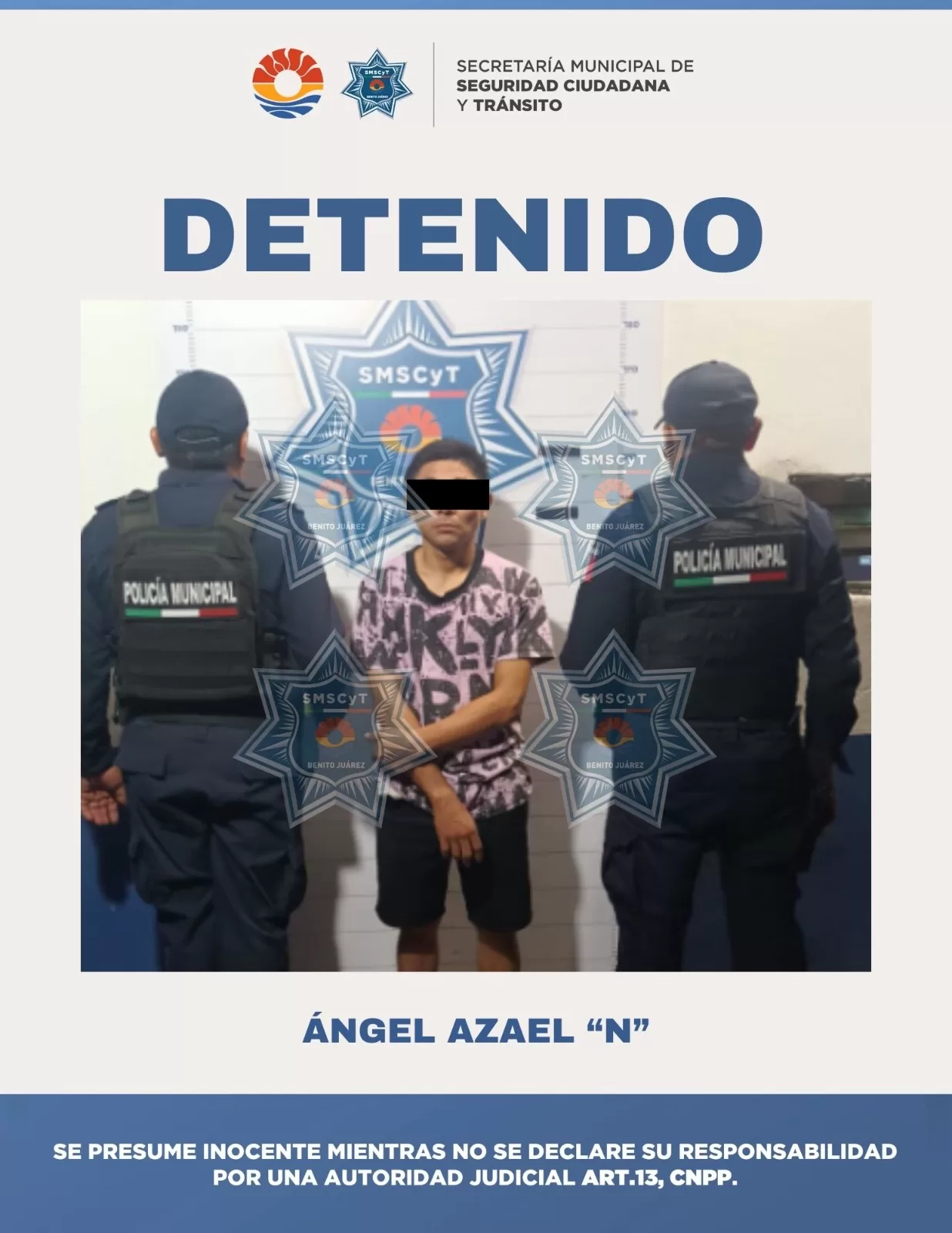 Cancún, 20 de agosto (InZoom.mx).– Elementos de la Secretaría Municipal de Seguridad Ciudadana y Tránsito de Benito Juárez detuvieron a un hombre identificado como Ángel Azael “N”, de 25 años, acusado de desobediencia y resistencia de particulares.