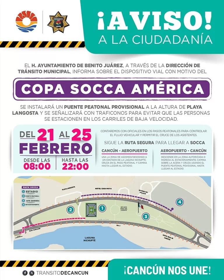 Cancún, 21 de febrero (Infoqroo).- A partir de hoy y hasta el domingo, fecha en la que la ciudad será sede de la competencia internacional “Copa Socca América Cancún MX 2024”, la Dirección de Tránsito Municipal empleará un dispositivo vial a la altura de Playa Langosta en la Zona Hotelera, a fin de garantizar la seguridad de participantes y aficionados al fútbol.