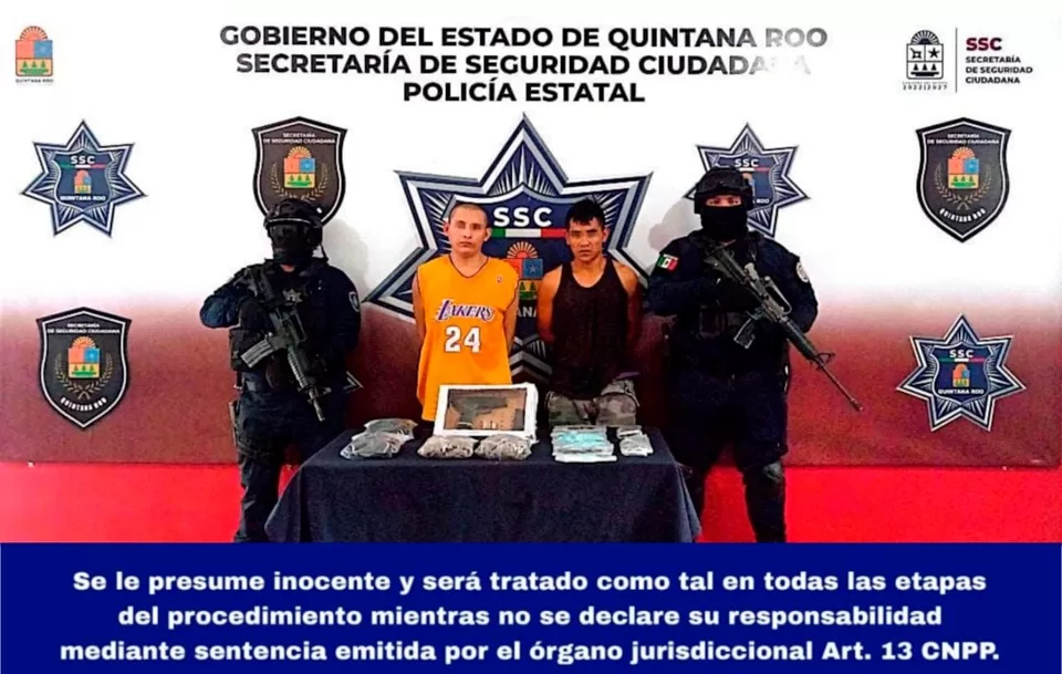 Cancún, 14 de noviembre (Infoqroo).- La Secretaría de Seguridad Ciudadana detuvo a Reynaldo “N” y Marcos “N”, presuntos implicados en delitos contra la salud y violación a la Ley Federal de Armas de Fuego y Explosivos.
