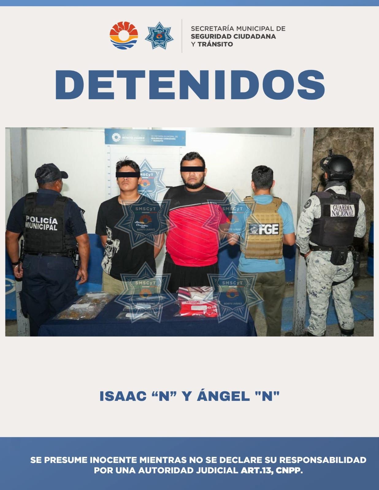 Cancún, 8 de agosto (InZoom.mx).- En acción coordinada entre la Secretaría Municipal de Seguridad Ciudadana y Tránsito (SMSCyT) de Benito Juárez, la Fiscalía General del Estado (FGE) y Guardia Nacional, fueron detenidos dos personas del sexo masculino, presuntos implicados en detelidos contra la salud.