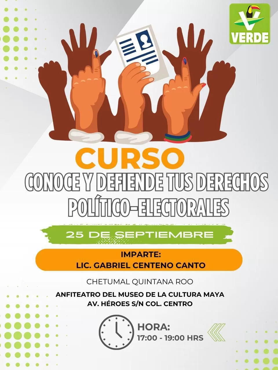 Chetumal, Q. Roo, 23 de septiembre de 2025.- El Partido Verde Ecologista de México en Quintana Roo, a través de su dirigente estatal, el diputado Renán Sánchez Tajonar, anunció la realización de dos cursos dirigidos a la ciudadanía con el propósito de impulsar la defensa de los derechos político-electorales y promover la participación activa en los procesos democráticos.