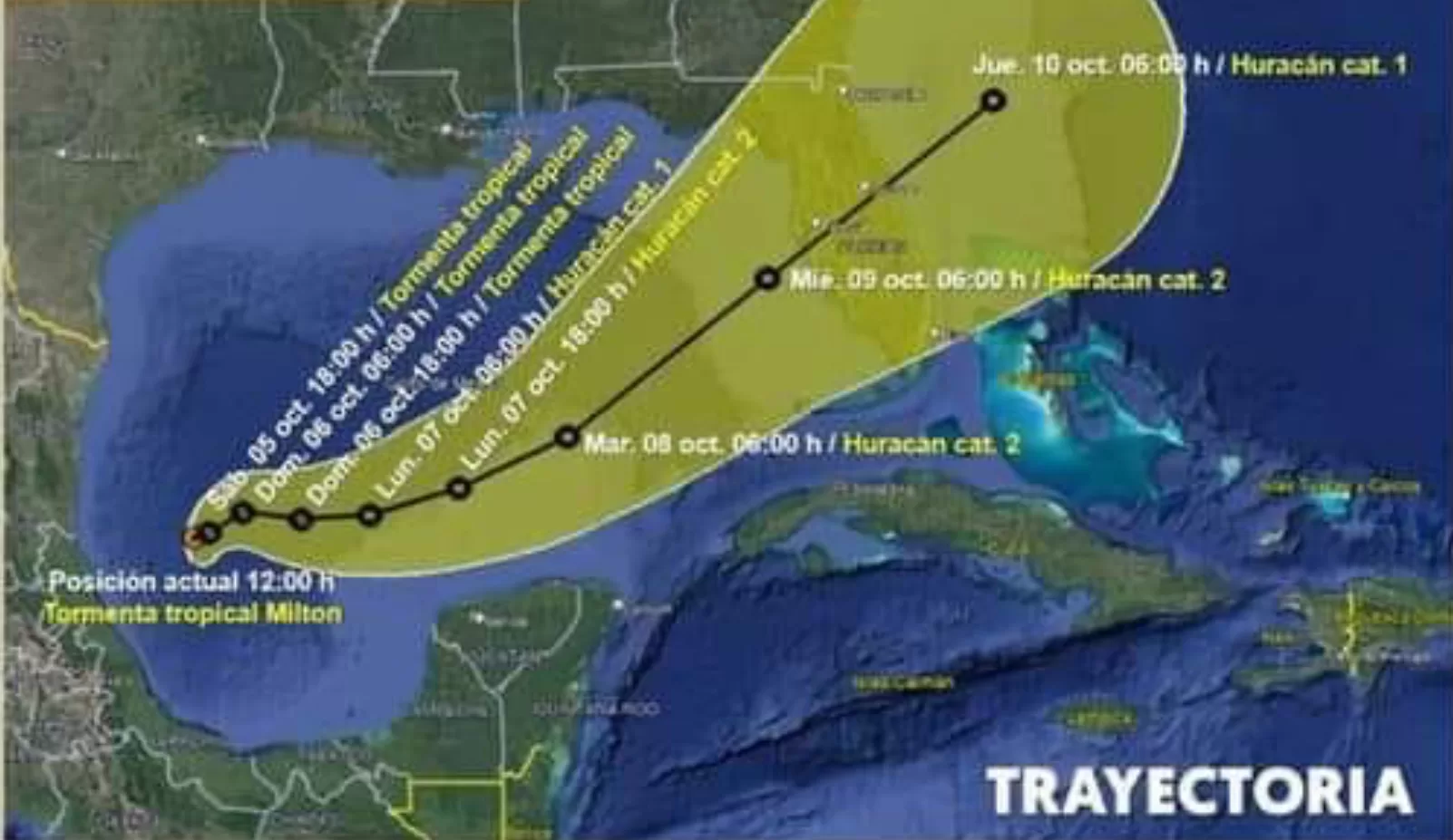 CANCÚN, 5 de octubre.— La depresión tropical 14 se intensificó y se convirtió en la tormenta tropical Milton en el golfo de México y avanza en sentido contrario en el que suelen encaminarse estos fenómenos.
